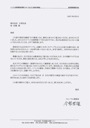 2007年9月1日 ノーベル化学賞受賞の白川英樹氏が高校生21名を対象に北海道大学理学部で導電性ポリマーを圧電性プラスチックフィルムに塗ってフィルムスピーカーを作る白川教室を開きました。大変好評で高校生からの反響も良かったとのことです。